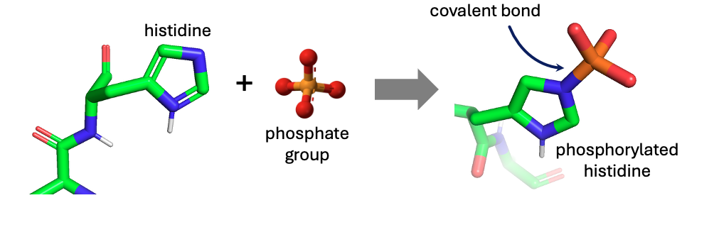 It is known from the literature that a phosphate group interacts and can form a covalent bond with the side chain of a histidine residue.